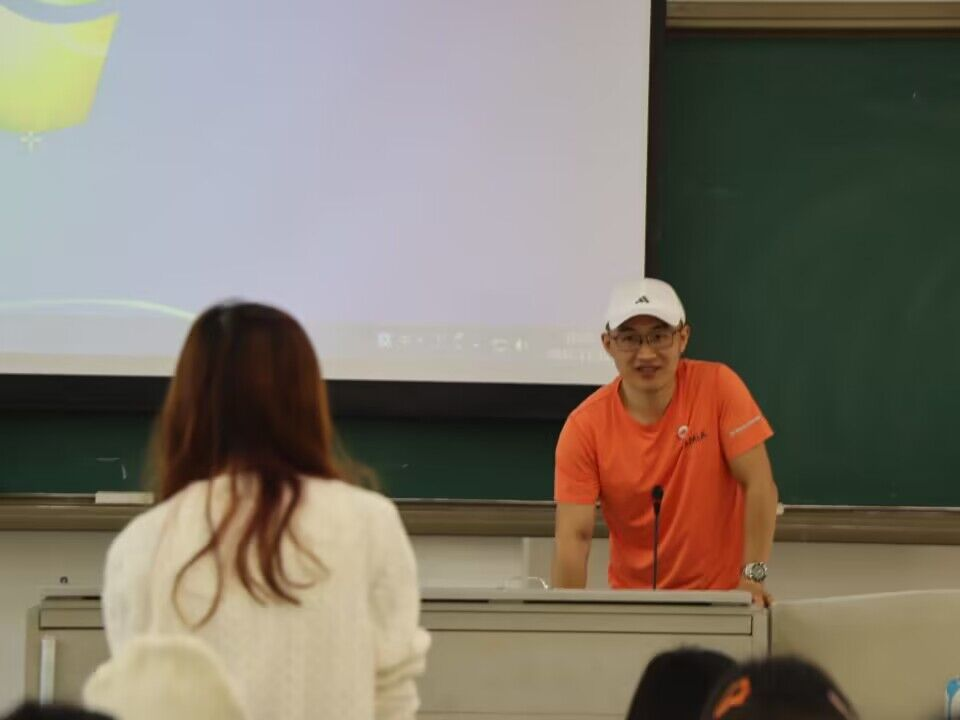 随后,校友刘巍分享了他的求职心得。他首先询问了在座学生对未来的规划和就业目标,进而鼓励大家要敢于走出去,看到更宽广的世界,尝试更多的可能性。他还用自己的亲身经历告诉大家,只有不断挑战自己,才能找到真正属于自己的舞台。