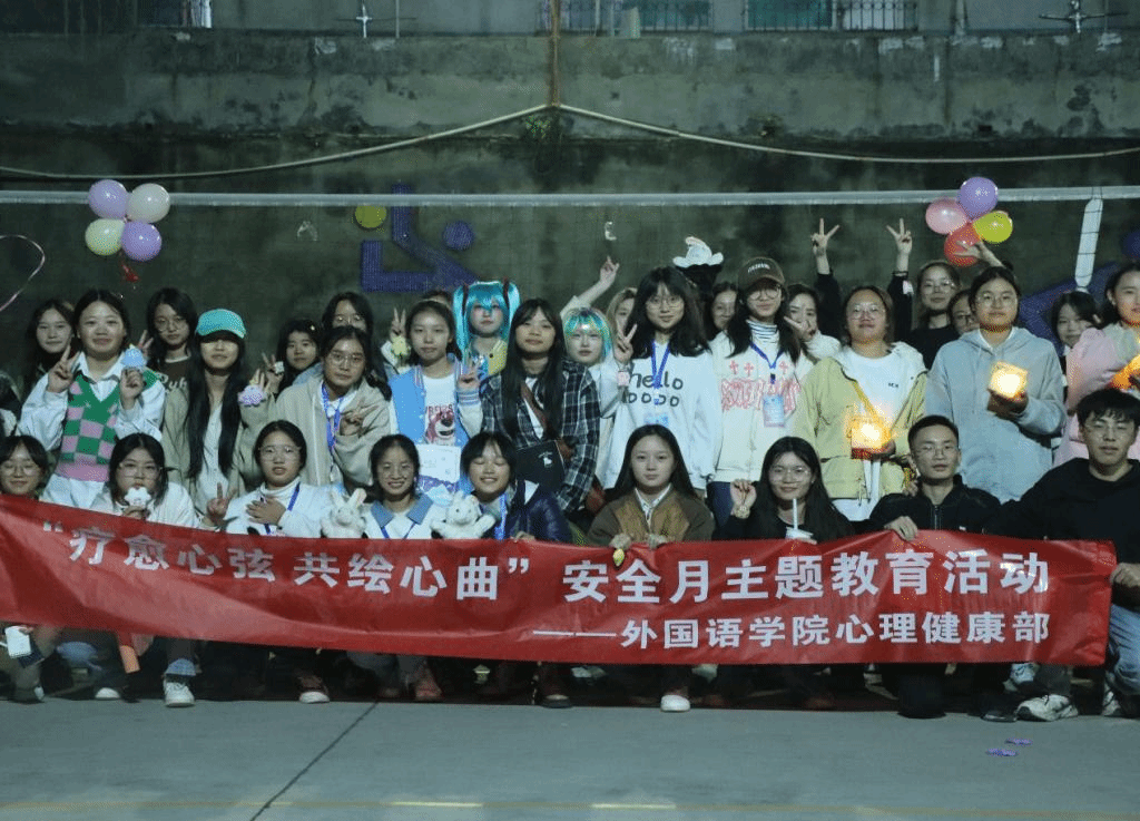 2023年11月26日晚,我院学生会心理健康部于排球场举行“疗愈心弦共绘心曲”安全月主题教育活动,各年级共有四十余名学生代表参与。