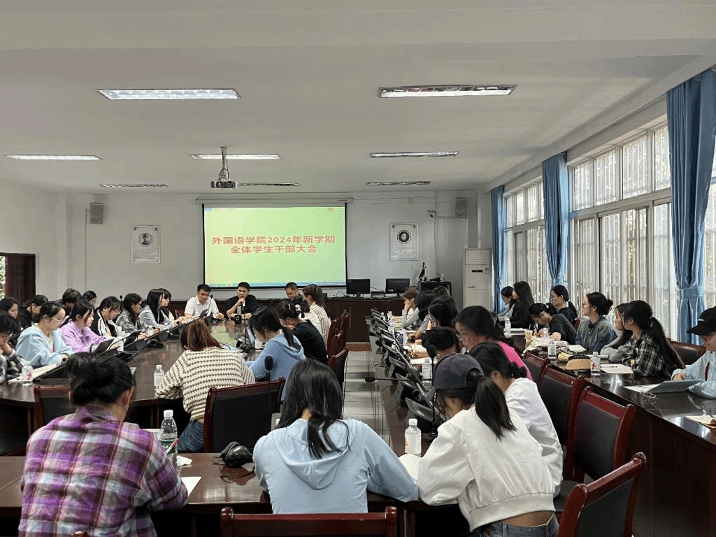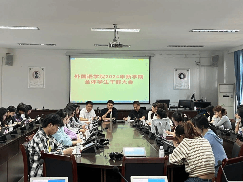 为加强学生干部队伍建设,充分发挥学生干部在学生日常管理中的重要作用,外国语学院于3月2日上午在明德楼三楼同传室开展了2024年新学期全体学生干部大会。本次会议由外国语学院党委书记付乔,学生科科长张健和分团委书记李树勇主讲,外国语学院全体学生干部参与了此次会议。