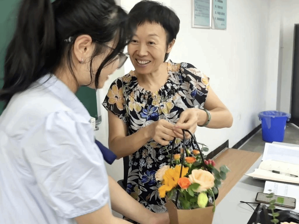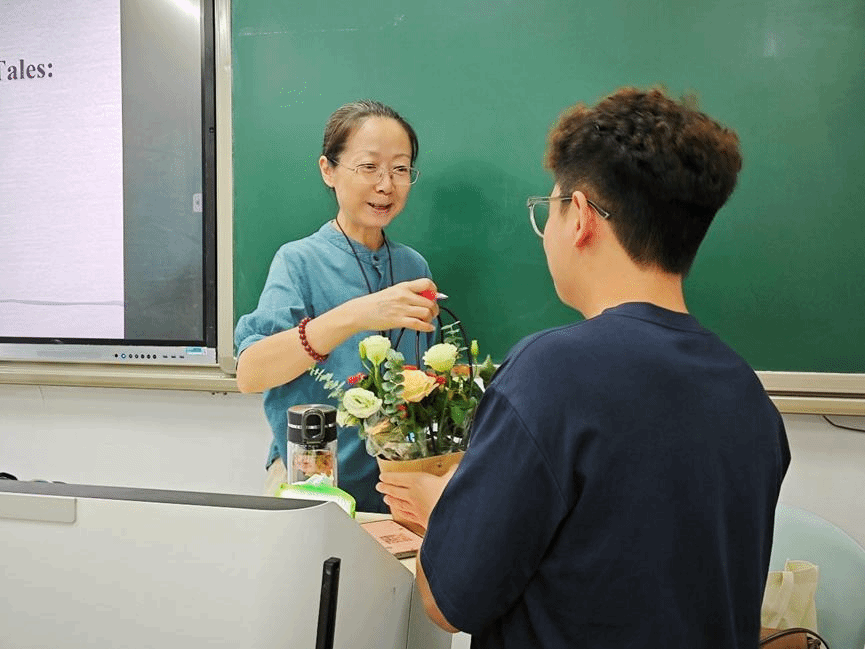 学生手捧鲜花走向每一位老师,将自己满满的感激之情融入花中。这些花儿不仅仅是自然界的馈赠,更是外院学子心中最真挚情感的载体。他们带着一颗颗跳动的心,走向那些在讲台上挥洒汗水,在书桌前默默付出的老师们。每位老师都被这份突如其来的感动紧紧抓住,激动、欣喜、感动的情感溢于言表。