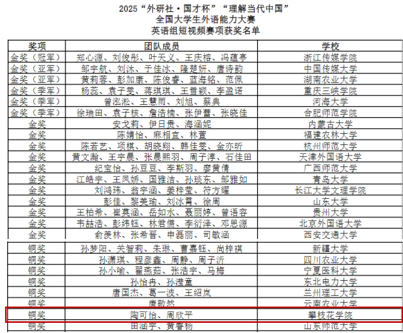 12月7日,2025年“外研社·国才杯”“理解当代中国”全国大学生外语能力大赛全国总决赛在北京举行,我校外国语学院参赛团队(团队成员:祝定逸、高科、陈帆、胡安乔;指导教师:严艳、刘小宇、付乔)荣获全国总决赛银奖。外国语学院与基础医学院组成的跨学院团队(团队成员:陶可怡、周欣平;指导教师:严艳、刘小宇、陈怡)荣获全国总决赛铜奖。实现我校学子在该项比赛全国总决赛中获奖零的突破。