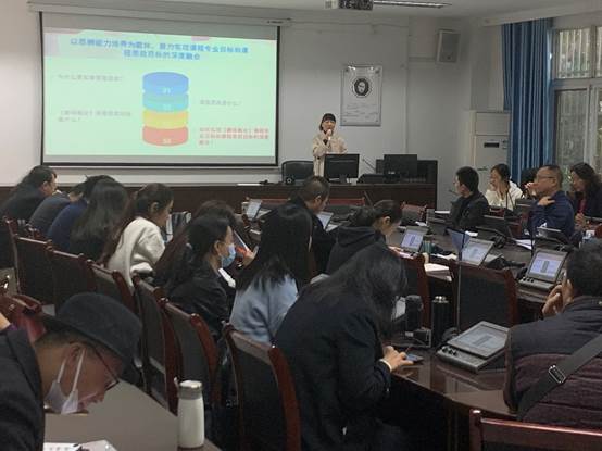 首先,由校级“课程思政”示范课程主讲教师夏敏老师进行了主题发言,夏老师基于《综合商务英语》教学中的课程思政,从对课程思政的认识、存在的误读、《综合商务英语》课程融入课程思政的可行性、融入方法、科学评价等5个方面进行了展示与汇报。夏敏老师认为商务英语专业课程融入课程思政,不仅能让学生学到商务英语专业知识,还能够实现育人改革的目标。有利于全面提升学生的素质,使其成长为既拥有扎实商务英语知识和技能又具有高尚品德的德才兼备的商务英语人才。