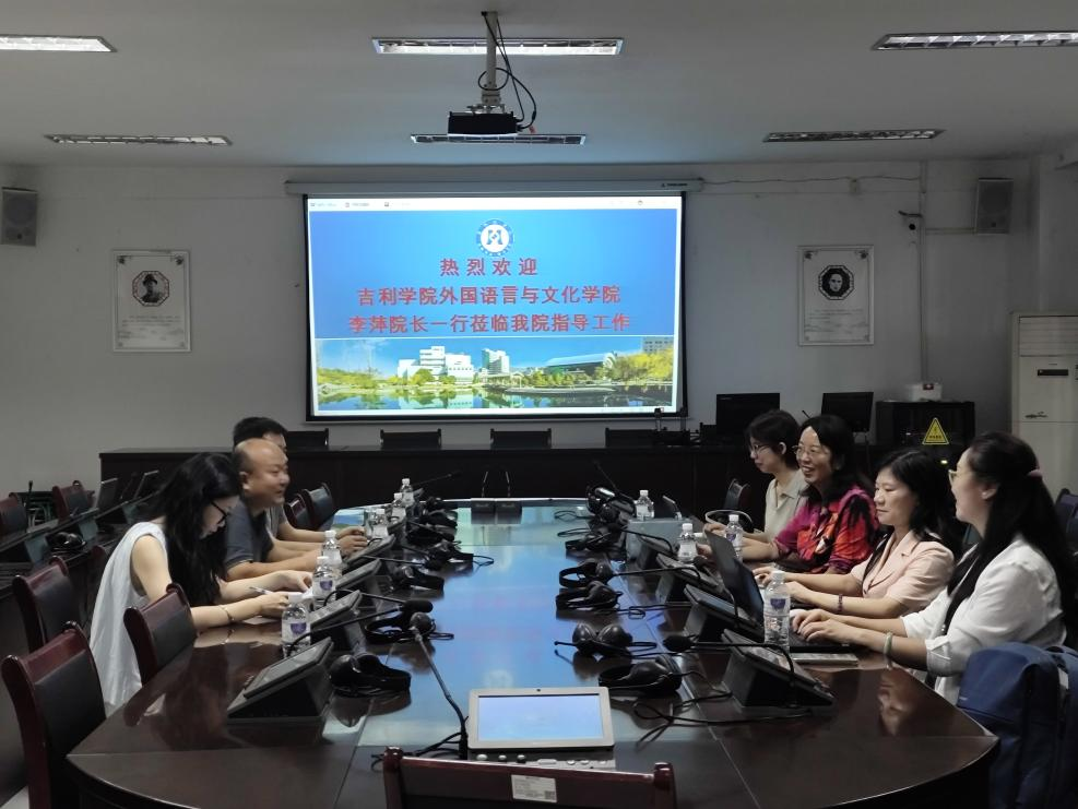 2025年9月19日,吉利学院外国语言与文化学院院长李萍率队到我院调研交流。我院副院长(主持工作)高朝阳、MTI中心副主任罗亮、教学科研科罗小雁参加座谈。