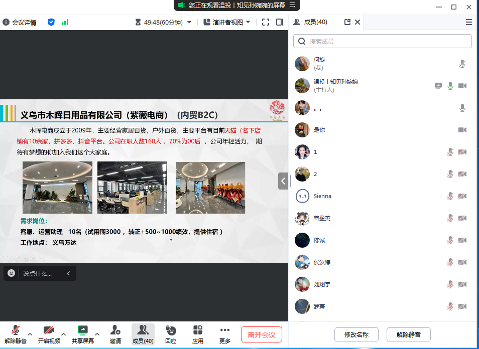 10月18日上午,我院与义乌市温投进出口有限公司联合开展了网络招聘会议,会议由20级辅导员何旋主持,共40人参与。