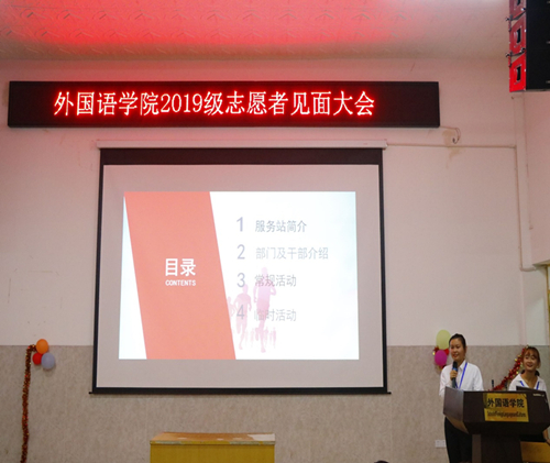 随后,学校学生志愿服务大队外国语服务站站长及各部门部长开展了志愿者见面大会。通过此次思想政治教育及志愿者见面大会,让同学们更快适应大学生活,对自己的大学生活更加了解,对于加入了志愿者行列的同学们,相信有趣的志愿活动会使之得到不一样的人生体验。