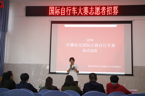 1115日下午,2019环攀枝花国际公路自行车赛志愿者招募面试选拔于外国语学院多功能厅顺利进行。担任此次面试的评委有外国语学院教师张晓红、贾济菡,学生刘梓涵、文琴、张涛以及攀枝花学院学生志愿服务大队秘书处李晓碧。