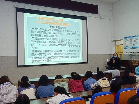 根据学校有关寒假学生工作暨疫情防控的要求,本次年级大会分别从往返途中、寒假中新冠疫情防控,生命安全教育,感恩教育,防诈骗、防校园贷、防溺水教育,离校前安全教育,加强自律攀大人学习等六个专题为同学们进行了宣传引导。本次年级大会在外国语学院多功能厅召开。