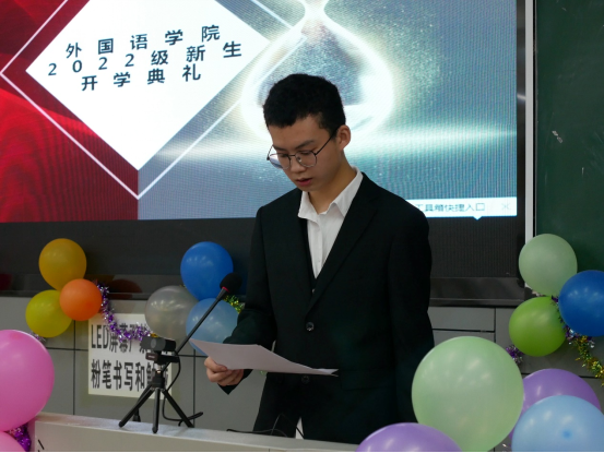2022年级英语专业学生奚永豪代表新生发言。他表达了自己初到攀大时的感受和对未来的规划,并同全体新生共同承诺:“以饱满的精神状态投入到大学中,不断突破自我,为祖国事业挥洒汗水。”