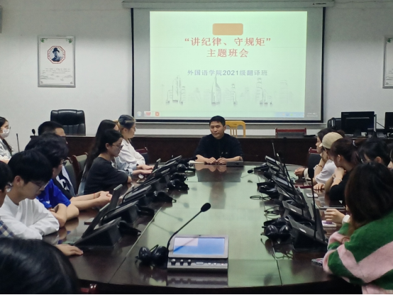 2022年11月3日晚19:40,外国语学院2021级翻译班在明德楼同声传译室开展了“讲规矩、守纪律”主题班会。