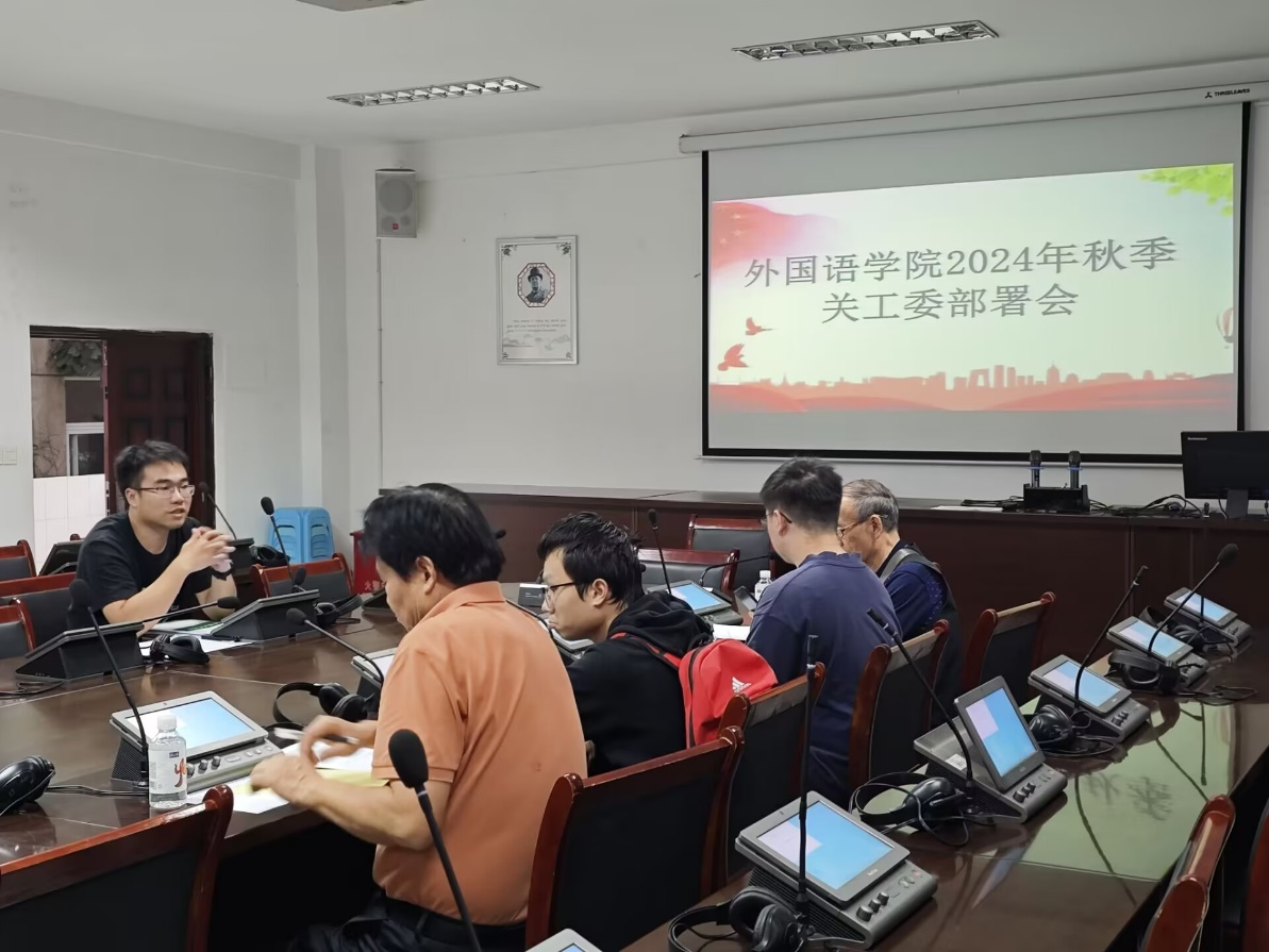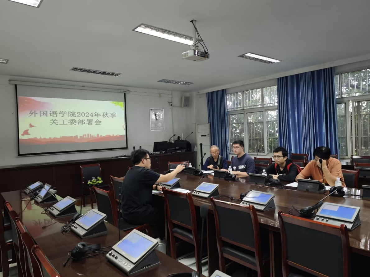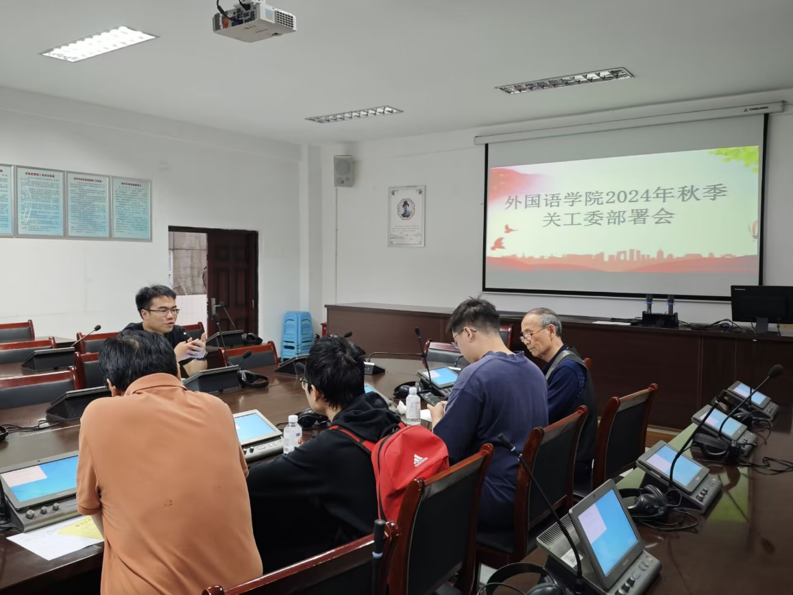 2024年10月24日下午,外国语学院在明德楼三楼同传室召开了秋季关工委工作部署会。本次会议旨在深化师生互动,推动学生全面发展,由外国语学院分团委书记李树勇主持,外国语学院关工委教师邓兴义和张彦青出席,以及结对帮扶学生罗啸和林祝民参加。