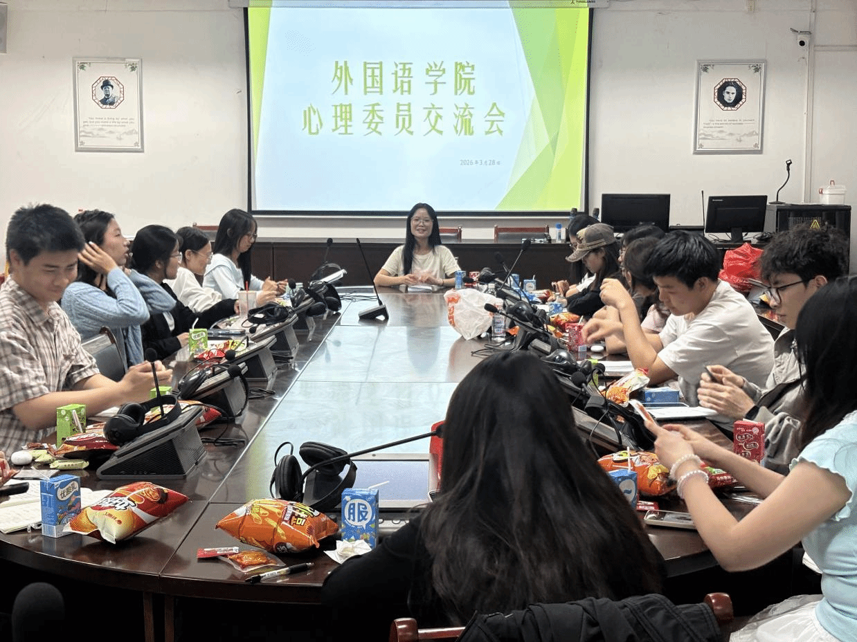 2026年3月28日晚,我院学生会心理健康部于公园校区明德楼三楼同传室组织召开心理委员交流会。本次会议由心理健康部部长刘彦孜主持,心理健康部干事及各年级心理委员出席会议。